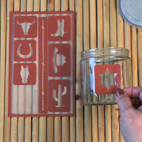 - Clean the design area thoroughly before placing the boot and cactus stencils on either side of the star. Look through the back of the jar to position the stencil images close to the star.